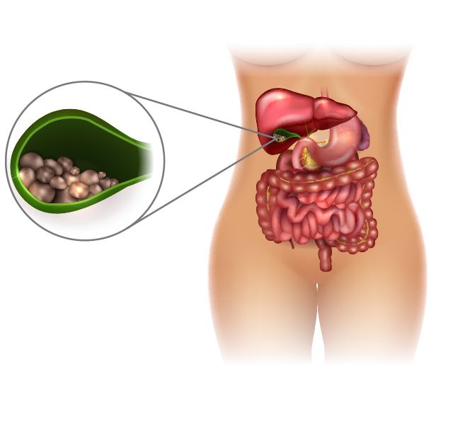 Gallstones are small stones inside the gallbladder. We usually recommend surgery only when gallstones cause symptoms such as pain, inflammation of the gallbladder (acute cholecystitis), inflammation of the pancreas (pancreatitis) or other related symptoms.